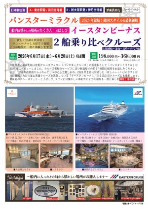 大阪南港と釜山を結ぶ定期クルーズフェリー「パンスタークルーズ」の新造船「パンスターミラクル」と「元ぱしふぃっくびいなす」で現在は韓国人向けの釜山発着クルーズを実施する「イースタンビーナス」の2船を楽しむ企画です。