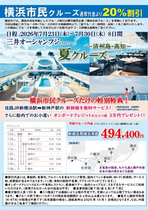 • 【2026年4月20日公開】2026年7月23日出発 三井オーシャンフジ 夏クルーズ~済州島・高知~≪横浜市民クルーズ≫