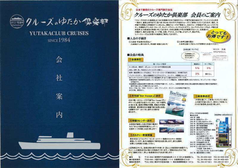 クルーズのゆたか倶楽部は1984年創業の日本で最初のクルーズ専門の旅行会社です。ワンナイトから世界一周まで、創業以来今までに延べ約200,000名の方々が当社クルーズにご参加いただいております。現在、日本船では商船三井客船の「にっぽん丸」、郵船クルーズの「飛鳥Ⅱ」、日本クルーズ客船の「ぱしふぃっくびいなす」、外国船もプリンセス・クルーズ、キュナードライン、ロイヤルカリビアン、セレブリティクルーズなど、河船も含め世界30数社の船会社の取扱いをしております。日本は花火や夏祭りを観覧するコース、北海道から沖縄まで、海外は地中海、エーゲ海、北欧、アラスカ、カリブ海、オセアニア、南太平洋、リバークルーズなど世界中の船旅をご案内しております。
