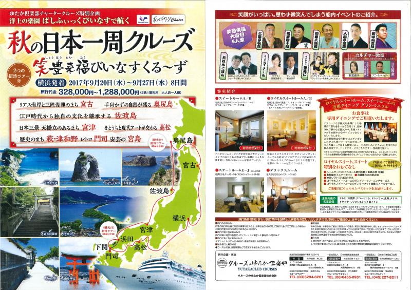 【おすすめクルーズのご案内】9/20出発 ゆたか倶楽部チャーター ぱしふぃっくびいなす 秋の日本一周クルーズ