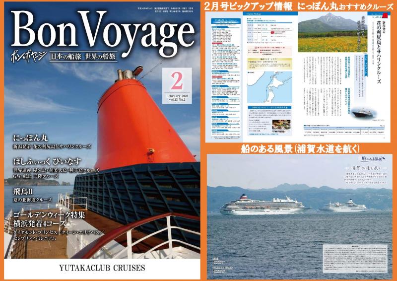 クルーズのゆたか倶楽部が発行している業界唯一の月刊誌「Bon Voyage(ボン・ボヤージ)」2月号のご案内です。クルーズに関する話題から、クルーズを楽しむためのコツ、乗船されたお客様の声など、多くの話題を盛り込んだ月刊誌となっております。
