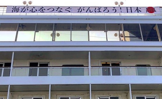 WEBカメラからはご確認いただけませんが、現在の飛鳥Ⅱには「海が心をつなぐ がんばろう!日本」というメッセージが掲げられています。