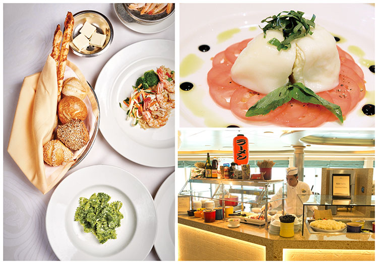 メイン・ダイ二ングのフルコース・ディナーをはじめ、ルームサービスに至るまで船内の食すべてにこだわっています。日本発着クルーズでは日本食もご用意しています。