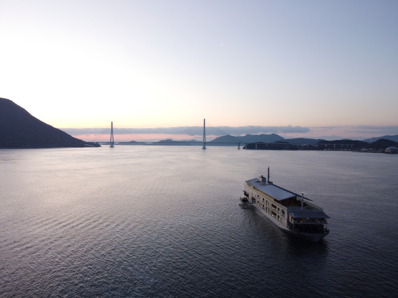 「せとうちに浮かぶ、ちいさな宿」をコンセプトに、2017年10月に就航した「ガンツウ」。建築家・堀部安嗣氏のデザインによる太陽や海の色を映し出すシルバー色の船体の中には、全室テラス付の客室のほか「お好きなものを、お好きなだけ」をコンセプトとするダイニング、海の見える鮨カウンター、目の前で和菓子をおつくりするラウンジ、檜の浴槽とサウナのある浴場などがある。穏やかな瀬戸内海を漂いながら島々が織りなす絶景や島の魅力に出会う、全19室の他に類を見ない贅を尽くした客船です。
