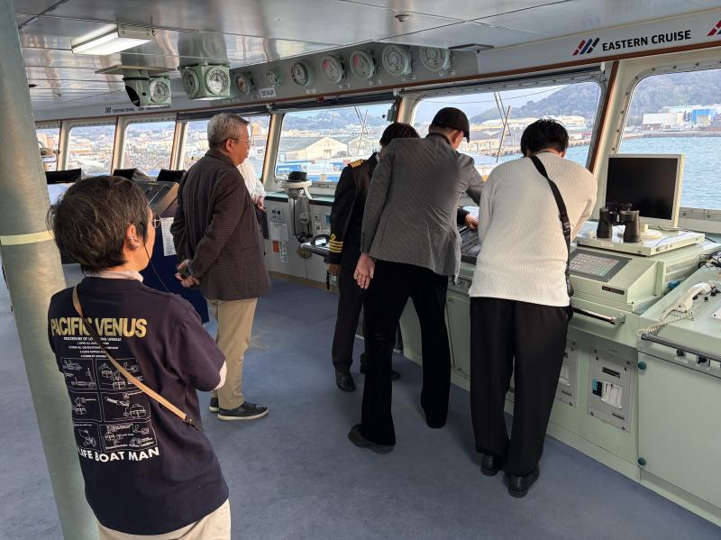 2日目の松山では無料招待ツアーへ。かつて木蝋で栄えた町「内子」では、雪が舞い散る中で現地を知り尽くしたガイドの越智さんによるユニークで深い知識を聞きながら、町の歴史を知っていただきました。その後、道後温泉では名物「宇和島鯛めしとじゃこ天」の昼食と、温泉や散策をお楽しみいただき、夕方に帰船しました。そして、当ツアーのメインイベント、松井克哉氏との時間では手始めに船側関係者の協力のもとイースタン・ビーナスのブリッジ(操舵室)へお客様をご招待。新旧キャプテンを交えての歓談にくわえて、貴重な顔ぶれでの写真撮影は一生の思い出になったことと思います。その夜の夕食も松井氏とテーブルを囲み、楽しい話や裏話(?)、昔の話や大変だった話など話題は尽きない素敵な時間となりました。食事の後のビンゴ大会も大変盛り上がりました(ぱしふぃっくびいなす時代と変わりビンゴカードは有料!)。