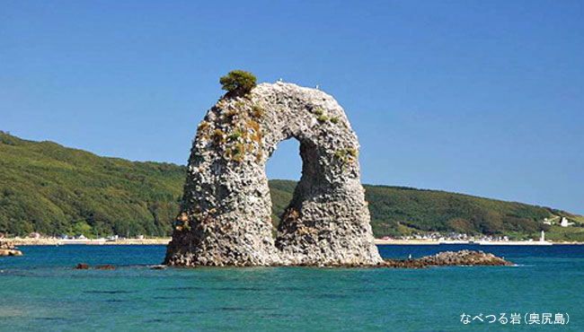 ターミナルがあるエリアは、公共施設や商店が集中し、明るくオープンな雰囲気に満ちています。日本海の荒波が作り出した奇岩「なべつる岩」、巨大モニュメントがある「うにまる公園」など、奥尻観光の代表的な名所も点在しています。また、夜間には、奥尻島の観光のシンボル「なべつる岩」はライトアップ、「うにまるモニュメント」は自動発光するなど、幻想的な世界も楽しめます。