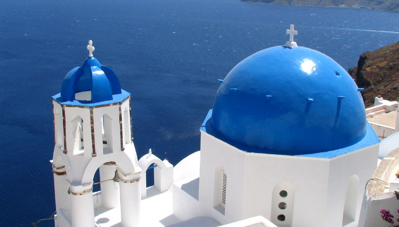 断崖絶壁の上に立つ街「フィラ」は、レストランやブティツクがひしめき合い観光客で大変賑わっている。島の最北端の村「イア」は、白い壁と青い屋根の教会の風景で知られている。