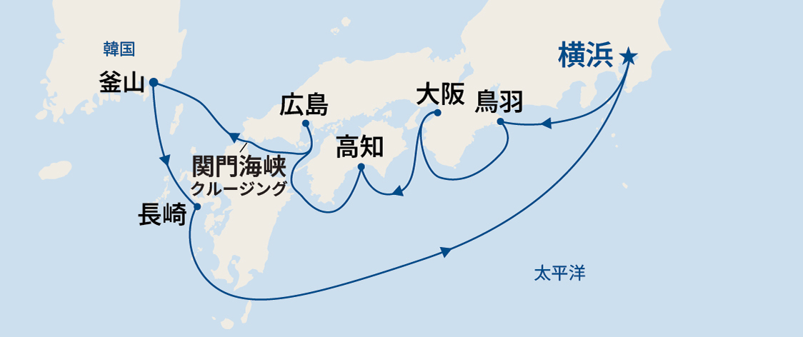寄港地では自由散策もしくはショアエクスカーション(寄港地観光ツアー:別料金)をご利用ください。 - 潮流の状況により、関門海峡の通過時間が変わるため、次港の入港時間が変更になる可能性があります。